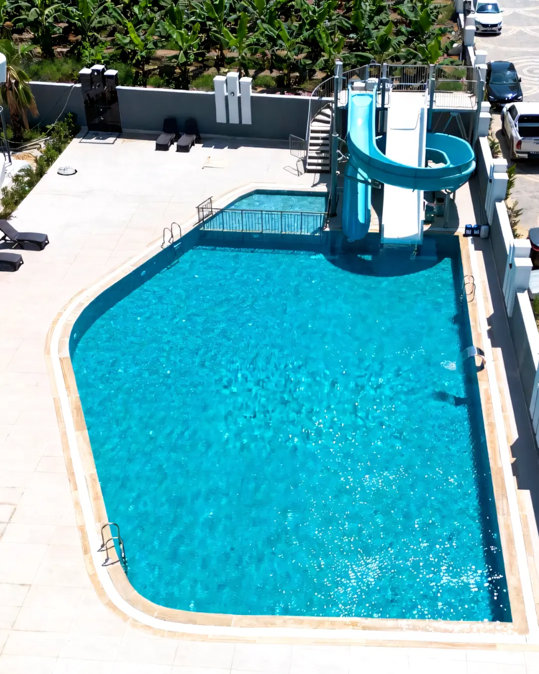 • A playful waterslide that brings a spark of joy to the water